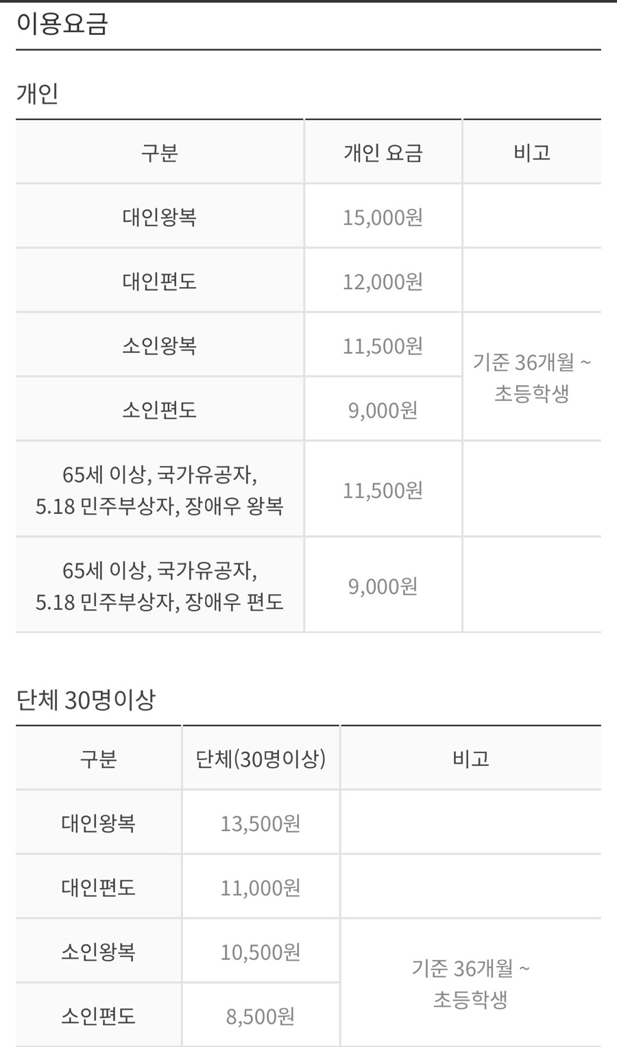 가격은 대인 왕복 기준으로 15,000원