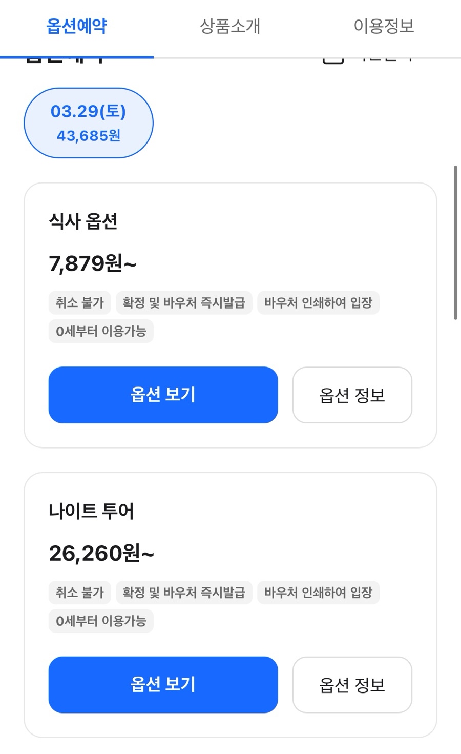 골라야 하는데 나이트투어와 식사 옵션을